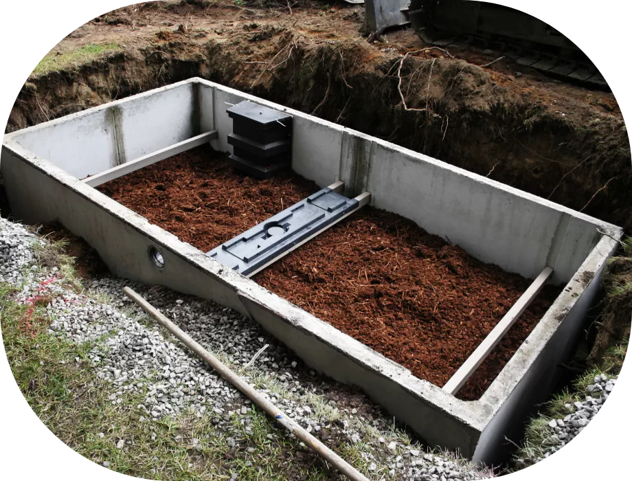 – grunt w postaci drenażu rozsączającego realizowanego w układzie poletka drenażowego, przy czym dla gruntów dobrze przepuszczalnych parametry poletka są następujące: powierzchnia 90 m2, podsypka żwirowa (żwir płukany, frakcja Ø=8-16 mm) grubości 20 cm (objętość żwiru – 18 m3), długość drenażu – 60 mb. Natomiast dla gruntów słabo przepuszczalnych: powierzchnia 150 m2, podsypka żwirowa – min. 70 cm (objętość żwiru płukanego we frakcji Ø=8-16 mm, 75 m3), długość drenażu 120 mb,